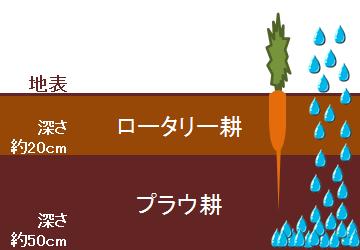 更にもう一つ恩恵があります。それは雨が降ったときでも水が深さ50cm位まで通り抜けるところです。ロータリーだけしか使わない場合は約20cmの深さに硬い岩盤があるので、そこに水が溜り易くなってしまいます。これが梅雨の時期に多量の雨が降り、その後夏の日差しを浴びると溜まった水のおかげでニンジンはどうなるか?・・・弱火でコトコト煮詰められた状態になり、ニンジンが畑で腐りやすくなってしまいます。